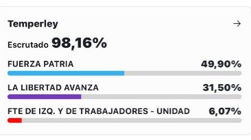En Temperley, la lista encabezada por Sol Tischik logró un resultado contundente: Fuerza Patria se impuso con el 49,90% de los sufragios, muy por encima del 31,50% obtenido por La Libertad Avanza. El Frente de Izquierda se ubicó en tercer lugar con el 6,07%.